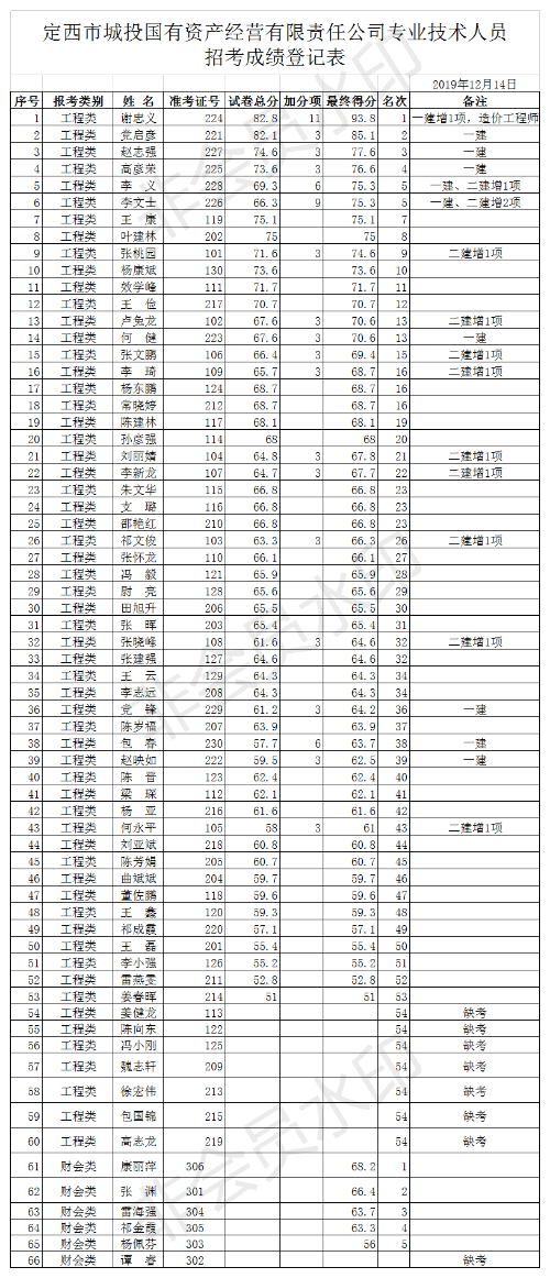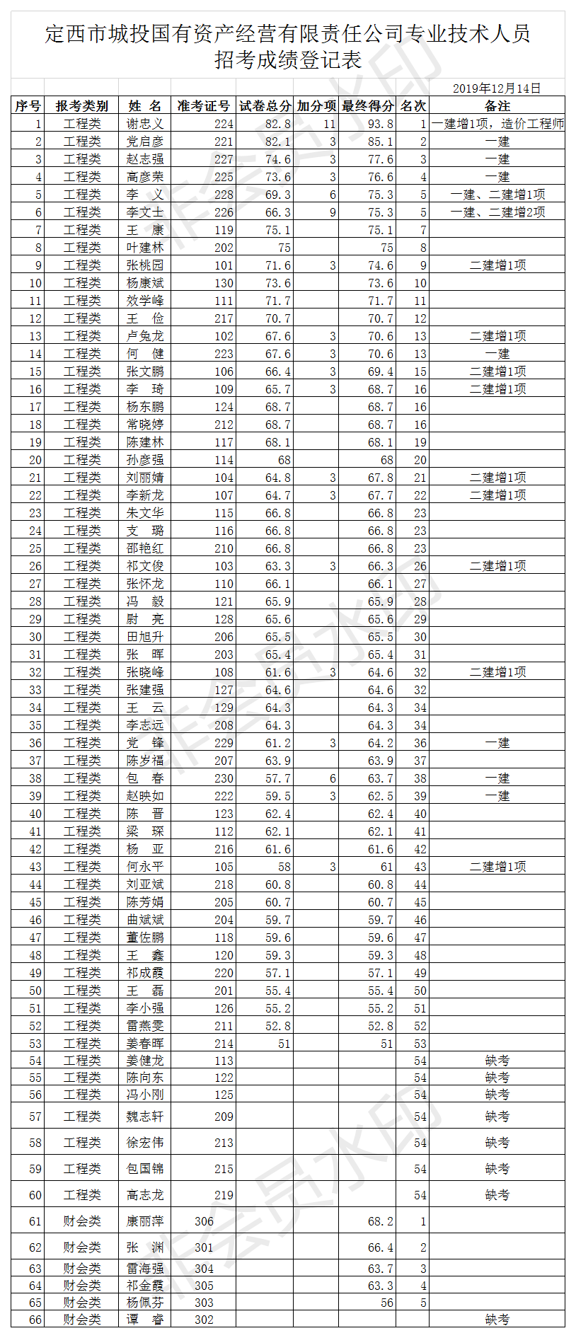 现将定西市城投国有资产经营有限责任公司招聘专业技术人员成绩予以公布,请查询。
