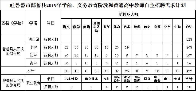 1.吐鲁番市鄯善县教育系统2019年学前、义务教育阶段和普通高中教师自主招聘岗位表