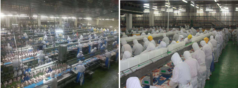 流水线工序:割腿、割翅、砍脖、撕小胸、摘心肺、扒嗉子、摘苦胆、拔毛、剔骨、修剪、挂鸡、摆盘、封口、入单冻、检验
