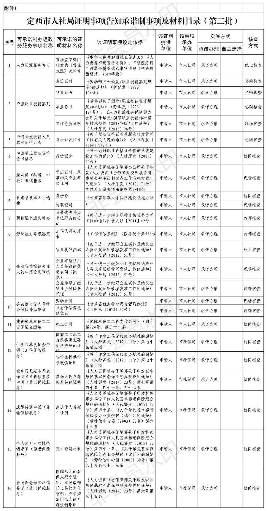 附件1:定西市人力资源和社会保障局证明事项告知承诺制事项及材料目录(第二批)