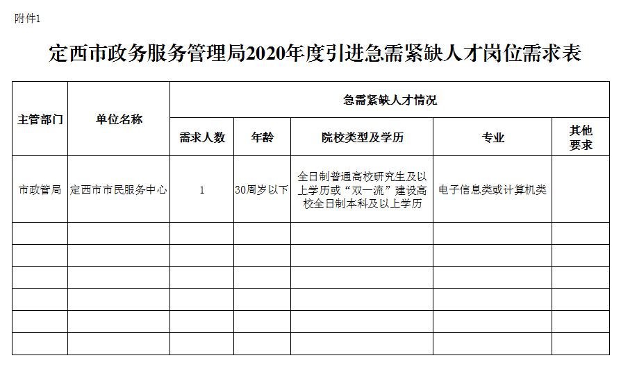 2020年为市政管局事业单位市市民服务中心引进急需紧缺人才1人(具体岗位及要求见附件1)。