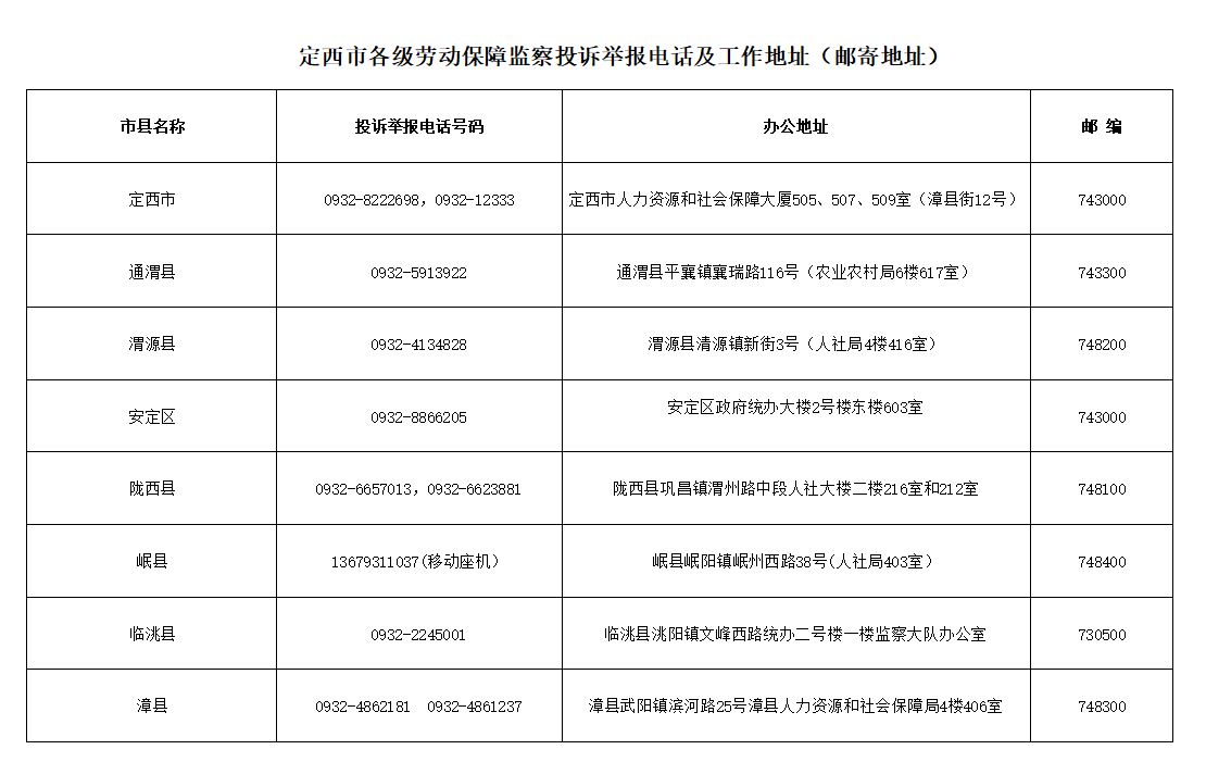 定西市各级劳动保障监察投诉举报电话及工作地址(邮寄地址)